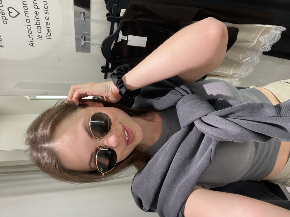 A female individual, appearing approximately 20-35 years old, with brown hair and light complexion, is shown in a close-up, chest-up portrait. She wears round, gold-framed Ray-Ban sunglasses, a grey ribbed crop top, and light-colored trousers. A dark grey sweatshirt is tied around her shoulders. Her right hand, adorned with a black scrunchie on the wrist, is raised near her temple. She displays a slight smile. The scene is set within a modern retail changing room in the city of Pompei, Italy. The background features light-colored walls. To the right, chrome hanging fixtures are visible, supporting various garments on hangers, including dark clothing and a light-colored item with lace trim. A partial circular white sign on the upper right wall contains Italian text, including "Aiutaci a mantenere le cabine libere e sicure" (Help us keep the changing rooms free and safe) and a heart symbol.