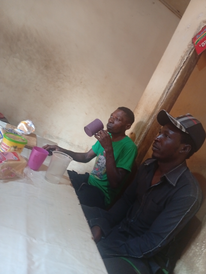 Two men are sitting at a table. The man on the left is wearing a green shirt and is holding a purple mug to his lips. The man on the right is wearing a dark collared shirt and a black cap. On the table are food items including bread, a yellow container and several cups. A wall is behind them. There is a small sign visible on the wall in the upper right corner.