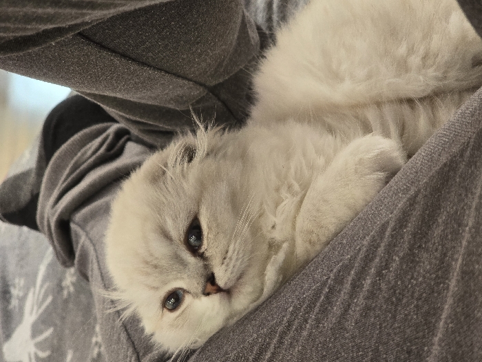 - "An upward-angled close-up shot depicts a light-colored, long-haired kitten resting on a textured dark grey fabric surface, likely a lap or blanket, in an indoor setting within the city of Plovdiv, Bulgaria" by FM-s2ZLx2, licensed under CC BY 4.0