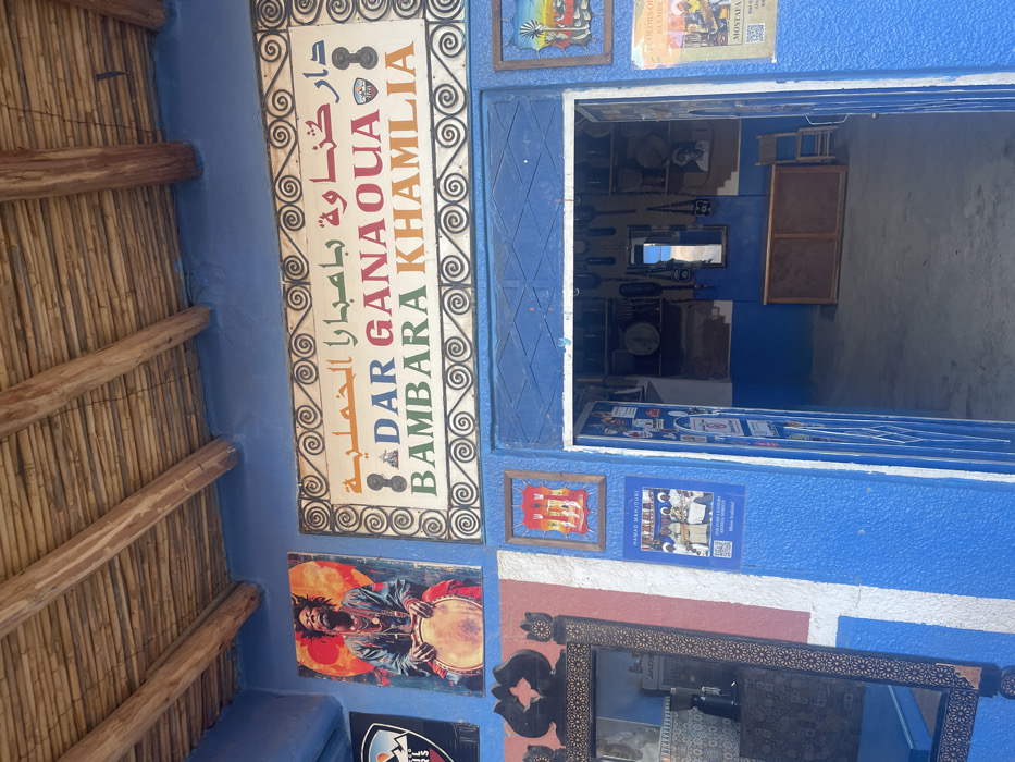 A blue wall displays a sign reading "DAR GANAOUA BAMBARA KAMLIA" in Arabic and English, surrounded by decorative swirls. Below the sign, other framed artworks are mounted, including a painting of a man playing a drum. An open doorway leads into a shop filled with various items, including musical instruments. The ceiling above has exposed wooden beams.