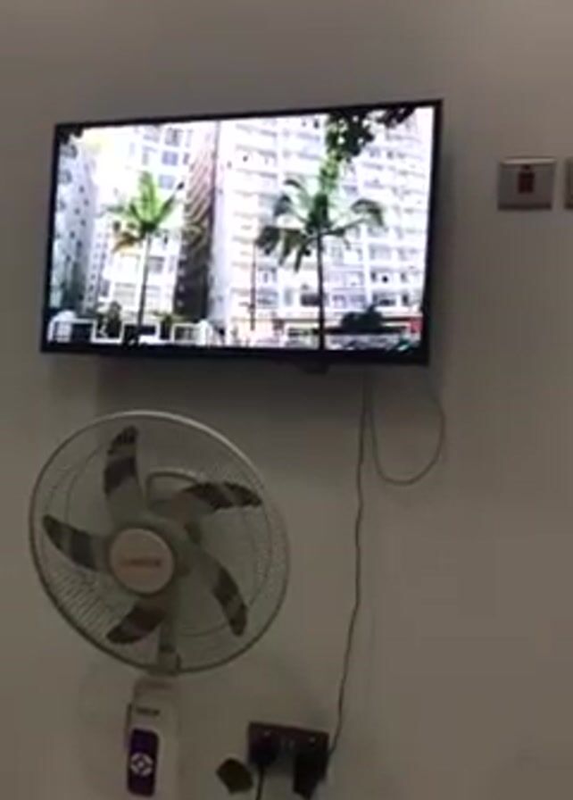 A TV screen mounted on a wall shows a scene with palm trees and tall buildings. Beneath the TV is a white stand fan with a silver grill. A power strip with two black plugs is on the wall below the fan. The wall is white and has two light switches near the top right. The video shows a static view of the scene.