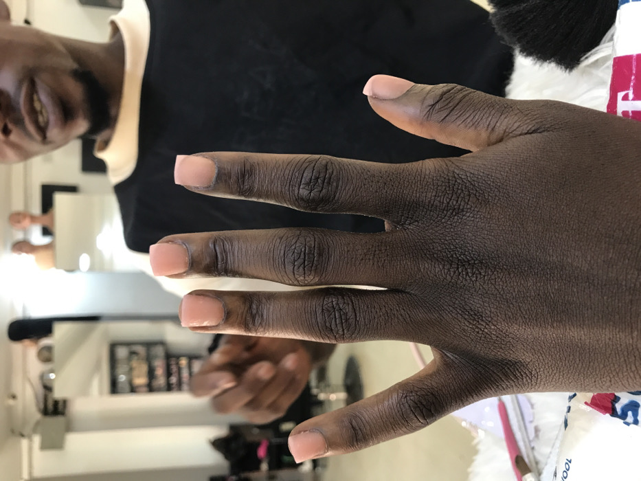 The image displays a close-up of a dark-skinned left hand, palm down, with fingers extended and nails featuring a matte, square-shaped, light peachy-pink polish