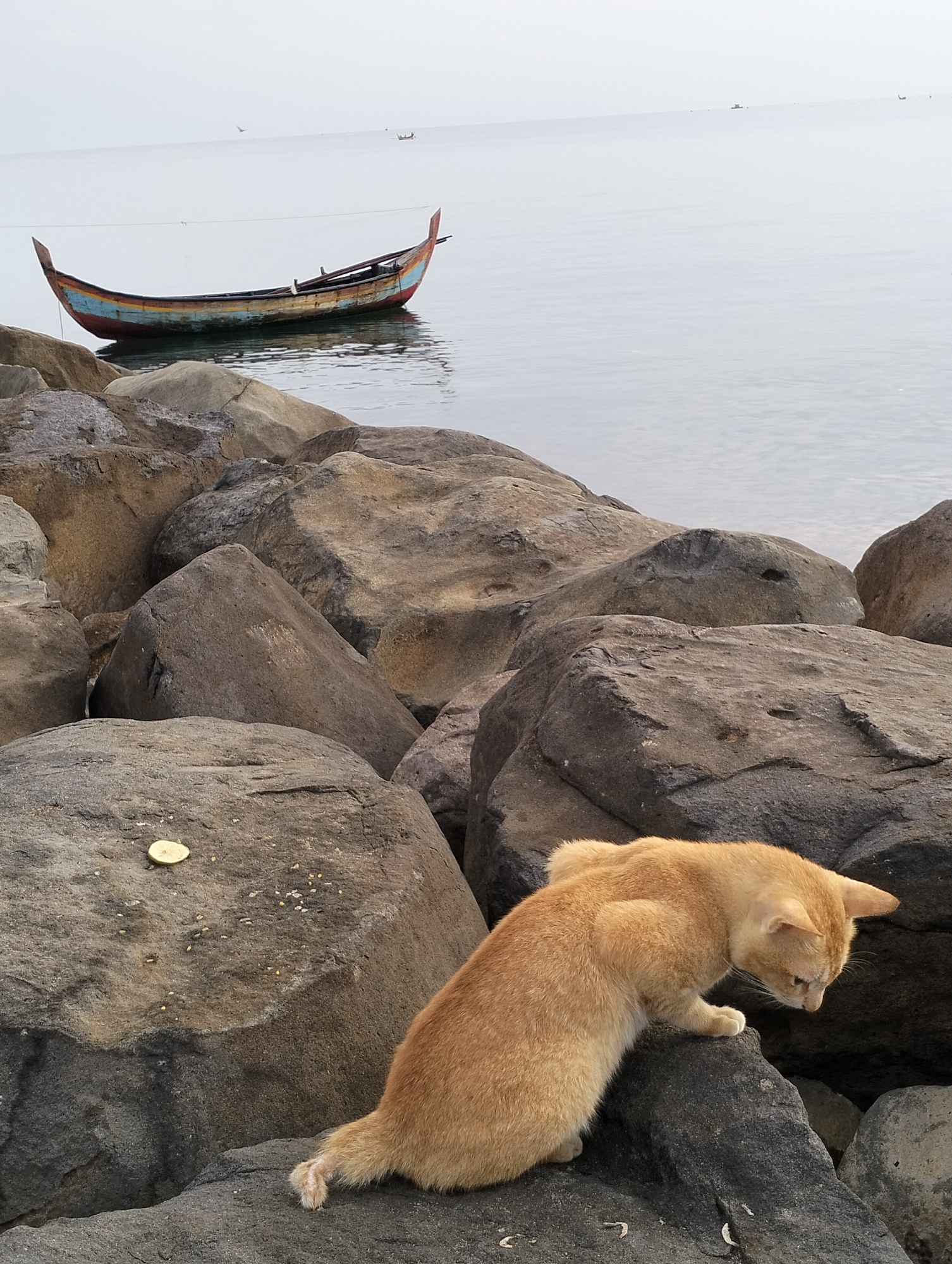 The image depicts an orange cat on a rocky shoreline at Lhokseumawe, Indonesia. A small, colorful wooden boat is anchored in the calm water. The sky is overcast. A yellow disc and some small food crumbs are on one of the rocks near the cat. No people are visible in the frame.