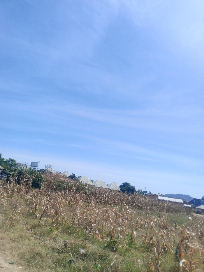 The image depicts a rural or semi-urban landscape in Barakin Angundi, Nigeria, under a clear blue sky with sparse, wispy white clouds. The foreground consists of a dry field dominated by numerous withered, light brown stalks, consistent with harvested or drought-affected maize (corn), interspersed with patches of dry green grass and visible dirt ground. A dirt track or path edge is present on the far left. In the midground, sparse green and brown vegetation, including small trees and bushes, separate the field from background structures. The background features a cluster of buildings with light-colored, likely corrugated metal, sloped roofs. On the left, a tall metallic water storage tank on a stand is visible. Further right, a row of identical-looking structures with white roofs extends across the mid-horizon. More buildings with similar characteristics are visible to the far right. Distant, hazy hills or mountains are discernible on the far right horizon. No individuals or animals are present in the scene. The lighting suggests bright daylight conditions.