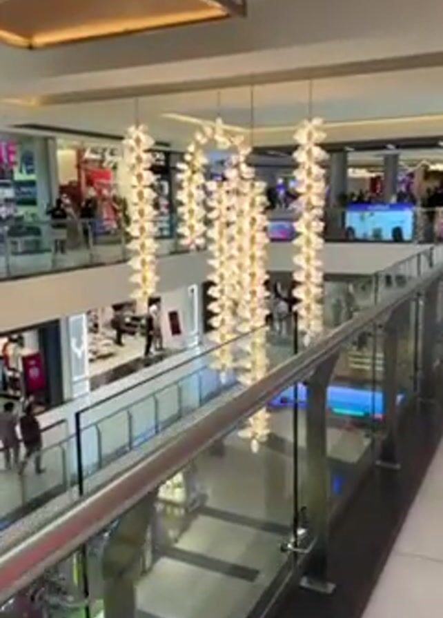 view from an upper level overlooking the interior of a multi-story shopping mall. Several large, vertically oriented light fixtures hang from the ceiling. The mall floors below feature tiled patterns. People are seen walking and browsing in different directions on the various levels. Glass railings line the upper level. Several shops and kiosks are visible on the mall floor.