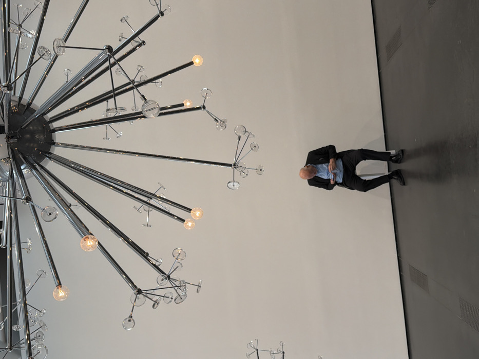 The image depicts an indoor scene within The Broad museum, located at 221 S Grand Ave, Downtown Los Angeles, California, United States of America. A large, multi-armed, chrome-plated chandelier, appearing to be an art installation, dominates the upper portion of the frame, suspended from an unseen ceiling. Its numerous arms extend radially, some terminating in illuminated spherical bulbs emitting a warm orange light, while others feature clear glass orbs attached at various points. In the lower half of the frame, a bald, elderly male individual is seated on a small, light-colored stool or low bench. He is dressed in a dark suit jacket over a light blue collared shirt and dark trousers, with dark shoes. The man is looking downwards, intently focused on a smartphone held with both hands at chest level, appearing to be operating the device. The background consists of a tall, unadorned white wall that meets a dark, reflective floor. A subtle, dark linear ventilation grate is visible on the floor to the left of the seated man. The environment is brightly lit, contributing to the reflective quality of the floor and highlighting the metallic surfaces of the chandelier.