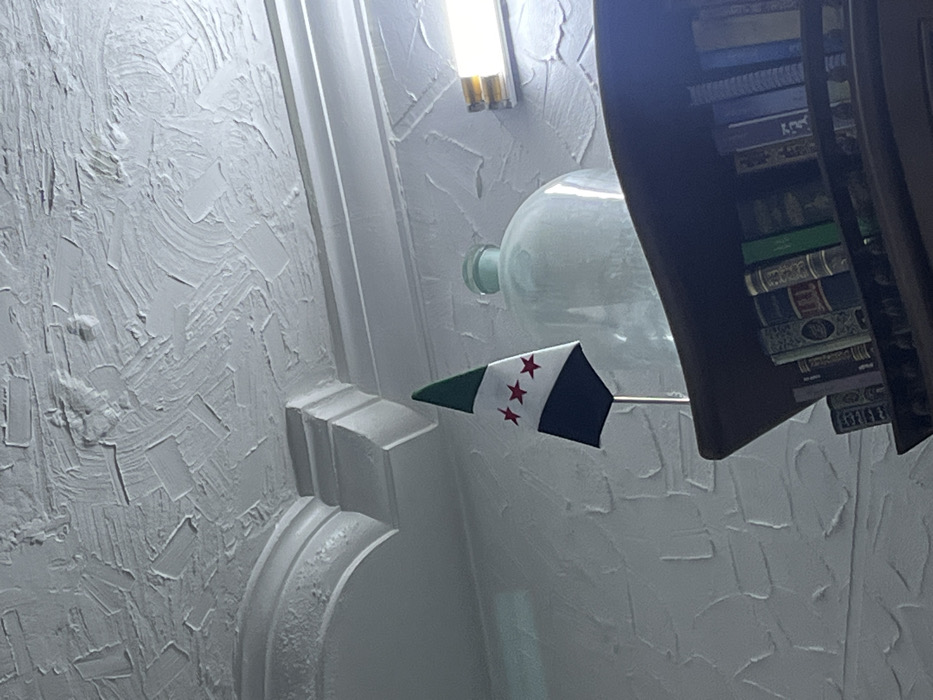 A miniature flag, featuring a green triangle on the left, a white middle band with three red stars, and a black right section, is positioned on a thin pole. The flag sits in front of a clear glass bottle. To the left, a white wall with textured plaster and decorative molding is visible. A bookcase filled with books obscures the right side. A light fixture is mounted above the bottle. The overall lighting appears soft.