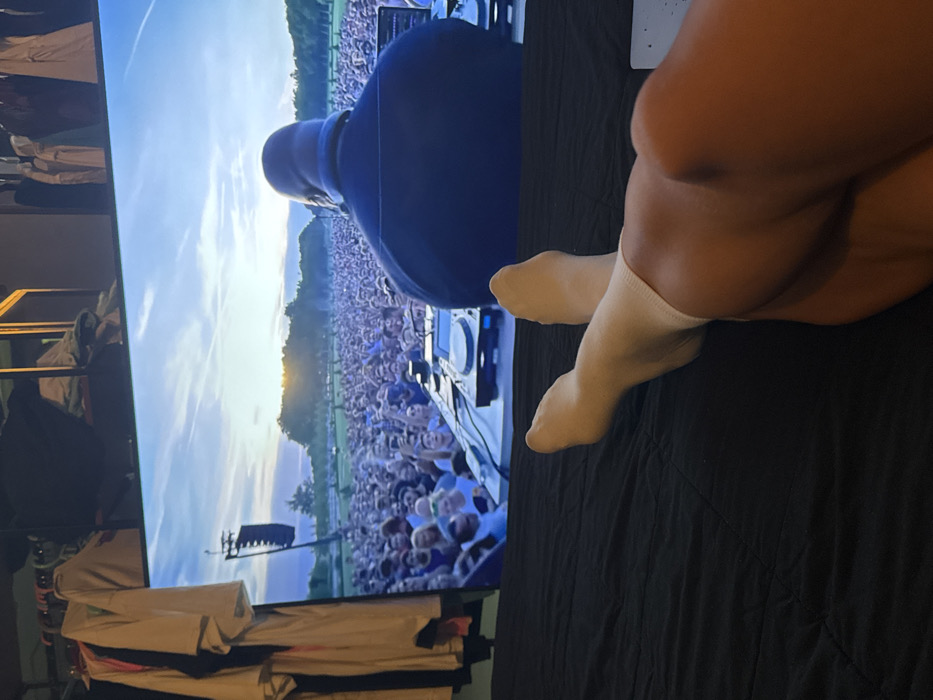 The image displays an indoor setting within Baan Chaweng Noi, Thailand. In the foreground, a person's lower legs and feet, wearing white ankle socks, are visible, extended and crossed at the ankles, resting on a dark, quilted surface, likely a bed or sofa. Ahead of them, a large flat-panel screen occupies the majority of the upper frame. The screen content depicts an outdoor musical event. A large-built individual, viewed from behind, wearing a dark shirt and headphones, stands at a DJ console, operating professional audio mixing equipment. This individual faces a vast crowd of people, densely packed across a grassy field, many with their hands raised. To the left of the screen's scene, a tall structure supporting a line array speaker system is visible. The sky above the event features scattered clouds and a warm glow on the horizon, indicative of a sunset or sunrise. In the upper left background of the room, behind and above the screen, a clothes rack with various hanging garments is partially visible.