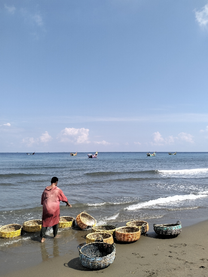 A man stands at the water's edge on a beach. He wears a red tunic and his lower legs are wet. Around him are woven baskets of varying colors. In the distance, the sea stretches to the horizon, dotted with several small fishing boats. The sky is a clear, light blue with scattered clouds. A few gentle waves are visible near the shoreline. The beach is dark sand.