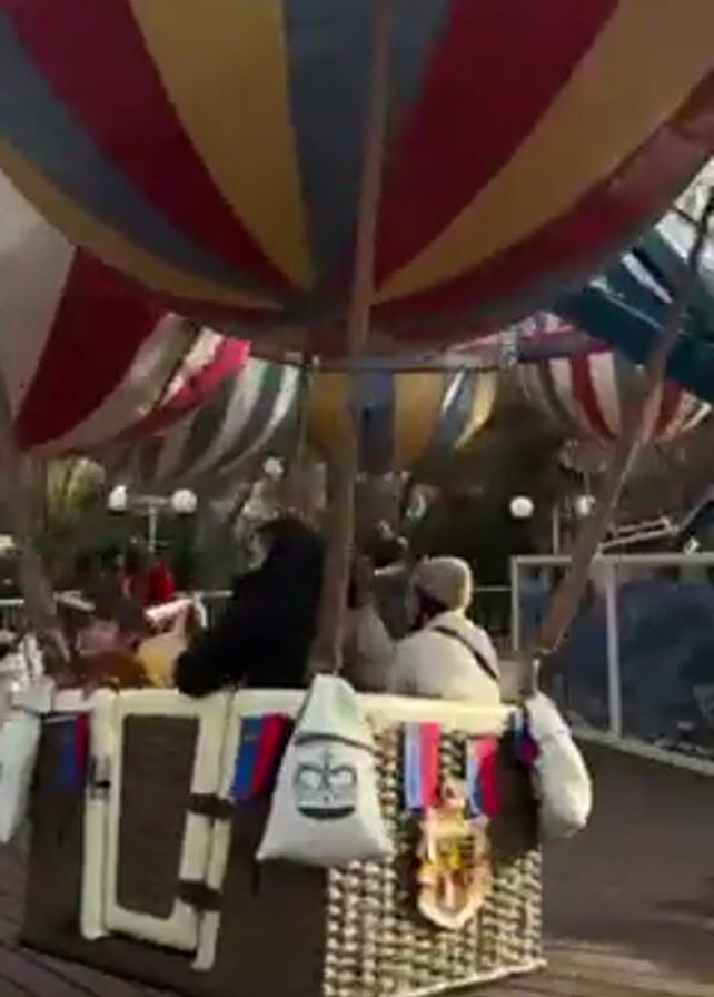 spinning amusement park ride. The ride consists of several hot air balloon-shaped gondolas, each carrying people. The gondolas are suspended from a central rotating structure. The base of the ride is a wooden platform. The sky is visible in the background. The ride appears to be in operation, with the gondolas moving in a circular motion. The environment appears to be a theme park.