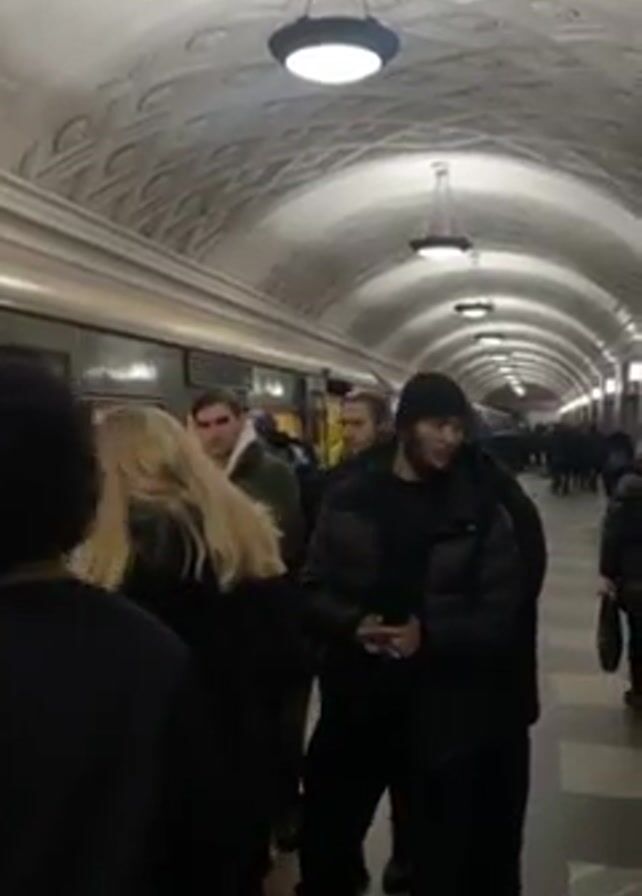 interior of a subway station. People are crowded near the open doors of a train, some entering, others milling around. Most people are wearing dark winter clothing. The station has an arched, decorated ceiling with hanging lights. The platform floor is tiled. The lighting is bright.