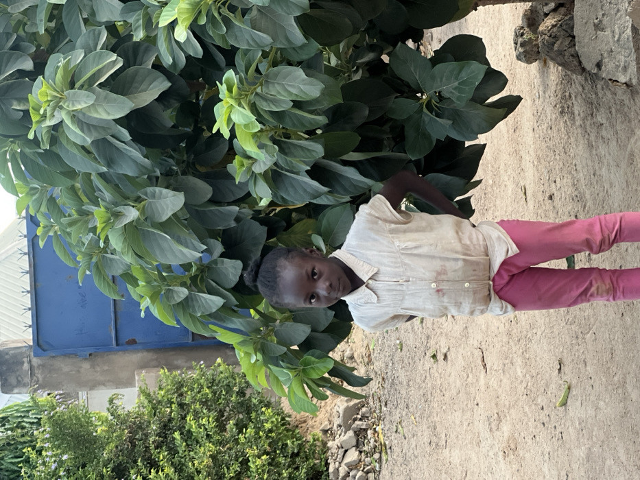 A child in a light-colored shirt and pink pants stands near a lush green tree. They appear to be outdoors on a dirt or gravel path. In the background, a blue gate or door is visible along with some bushes. The child is looking at the camera with one hand on their hip.