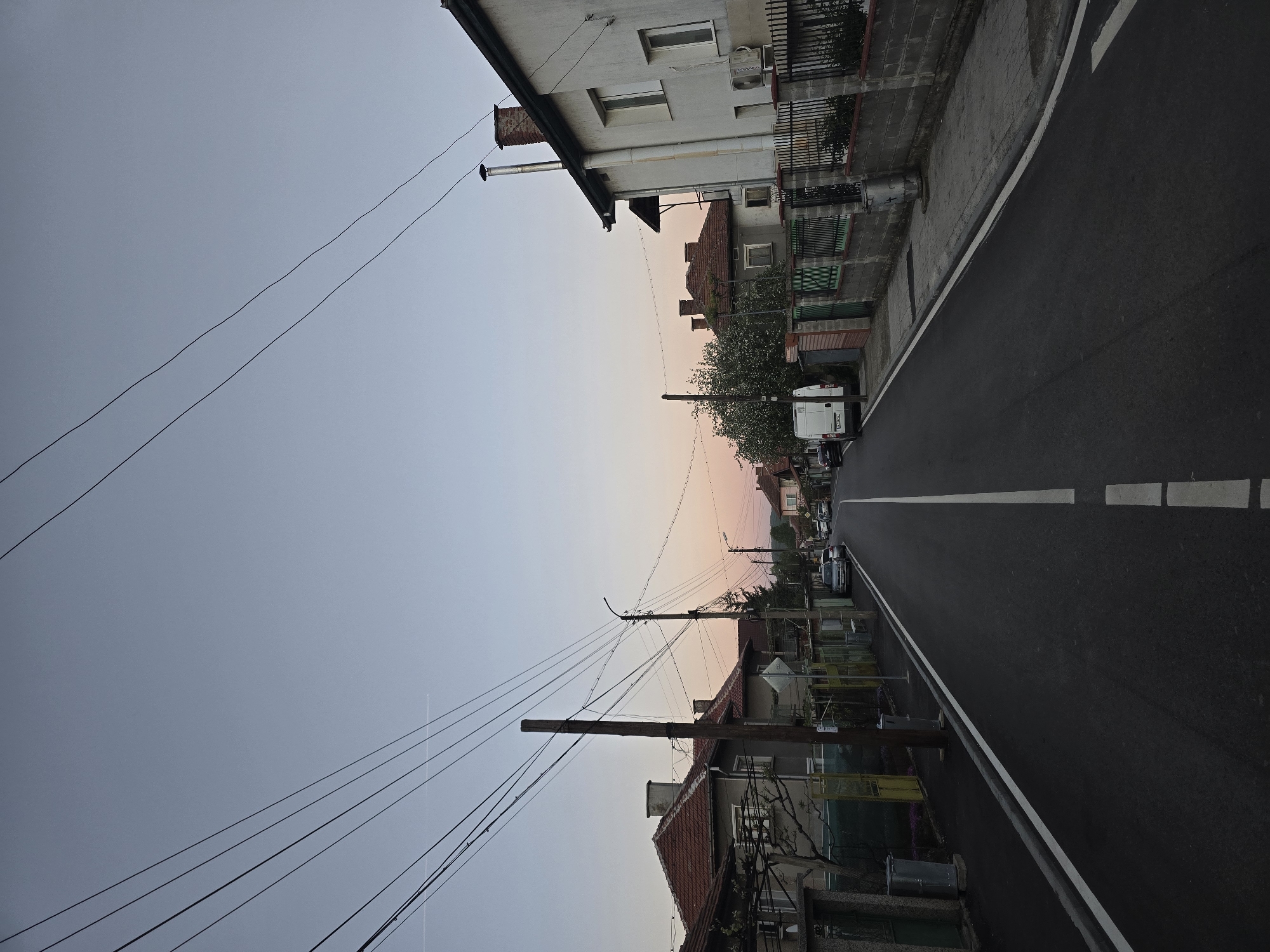 The image depicts a street in Berkovitsa, Bulgaria at dusk. The street is paved with asphalt, marked with a white centerline and edge lines. Buildings line both sides of the street; they are a mix of residential structures with varied architectural styles. Overhead power lines are visible, supported by wooden poles. Several vehicles are parked along the street, and some appear to be driving along the road. The sky is transitioning from blue to shades of orange and pink near the horizon.