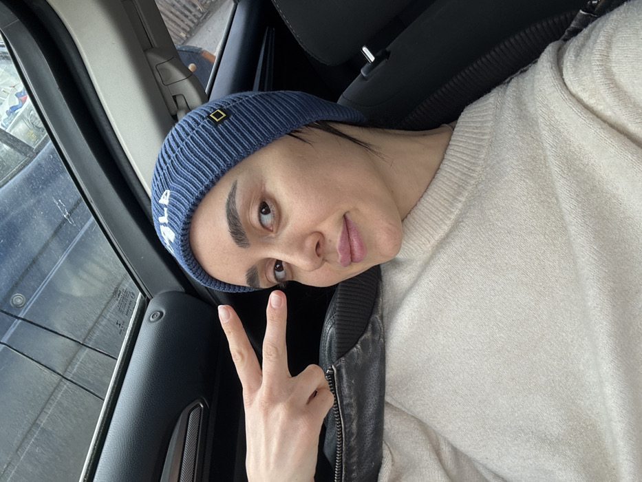 An individual is depicted in a close-up, chest-up shot taken from inside a vehicle. The subject is a female with fair skin, dark eyebrows, and short dark hair visible beneath a blue ribbed beanie. The beanie features white text reading "WILD" and a small yellow-gold square patch with a black diamond outline on the right side. She is wearing a light beige/cream-colored crew-neck sweater. Her left hand is raised, forming a peace sign with the index and middle fingers extended. Her facial expression shows a slight smile, and she is looking directly at the camera. Behind her, a black leather-like garment is partially visible. The interior of the vehicle, specifically the dark-colored door panel and overhead trim, is visible. Above, a panoramic sunroof reflects an indistinct exterior scene, including a dark vehicle and what appears to be part of a building or structure.