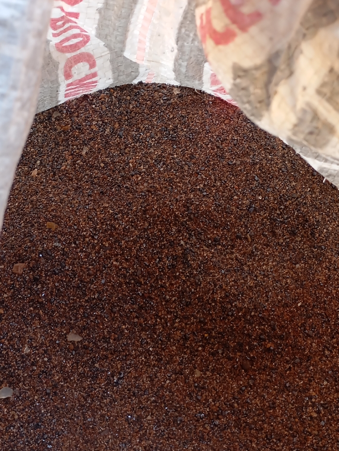 The image provides a forensic close-up view into a white woven polypropylene sack, partially open. The sack is filled with a dark reddish-brown granular material, consistent with coarse sand or fine gravel, occupying the majority of the frame. The granules exhibit varying sizes and some minor reflectivity. Faint red lettering, including the partial text "OOM" oriented upside down from the viewer's perspective, is visible on the inner surface of the sack's rim. No individuals, explicit actions, or direct interactions are visible. The scene is located in Jos, Nigeria, with the environment restricted to the interior of the bag.