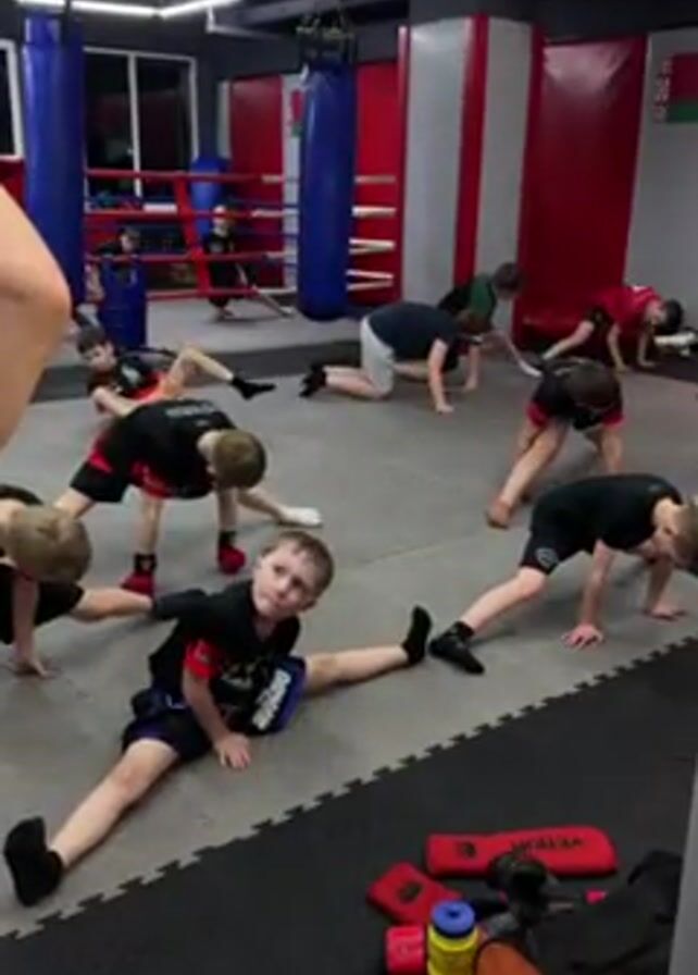 A group of approximately ten children are in a brightly lit indoor space that appears to be a martial arts training facility or gym