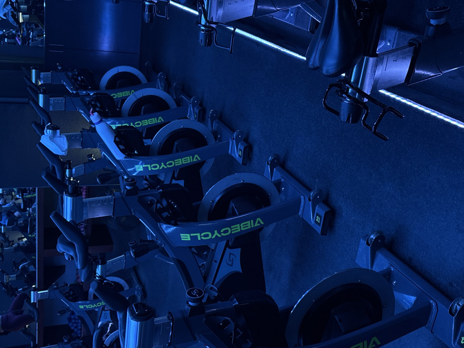 - "The image displays an indoor spin cycling studio located in San Andrés Cholula, Mexico, characterized by dominant blue ambient lighting" by FM-yooU93, licensed under CC BY 4.0