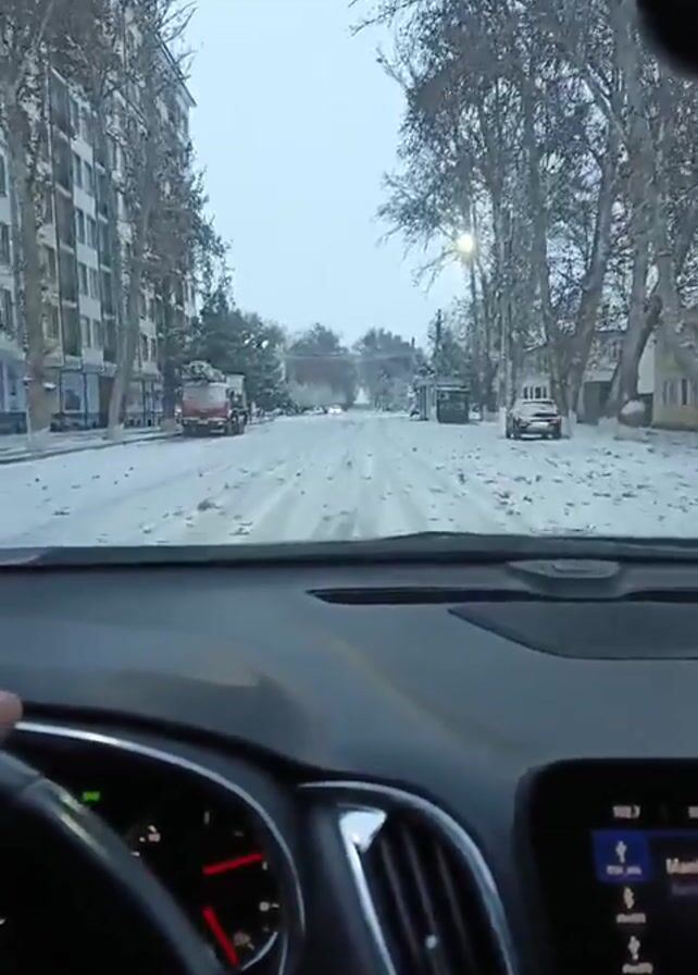 view from inside a car driving down a snow-covered street. Buildings line the left side of the street, and bare trees stand on both sides. Other cars are visible in the distance. The car's dashboard and steering wheel are in the foreground, and the speedometer shows the car is moving slowly. The screen on the dashboard displays what appears to be a music track. The weather is overcast.