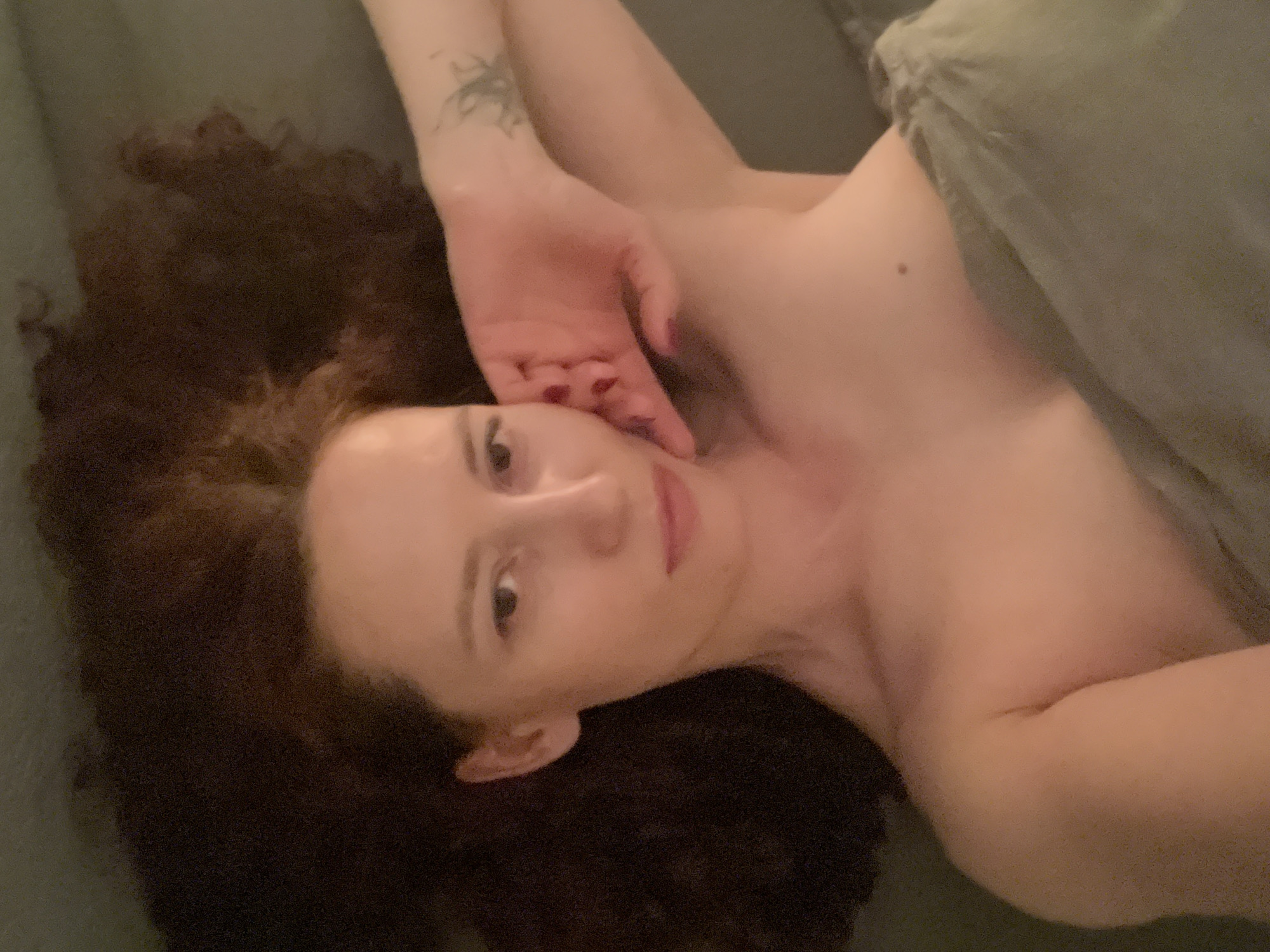 A woman with curly brown hair is lying on a green surface, partially covered by a green blanket