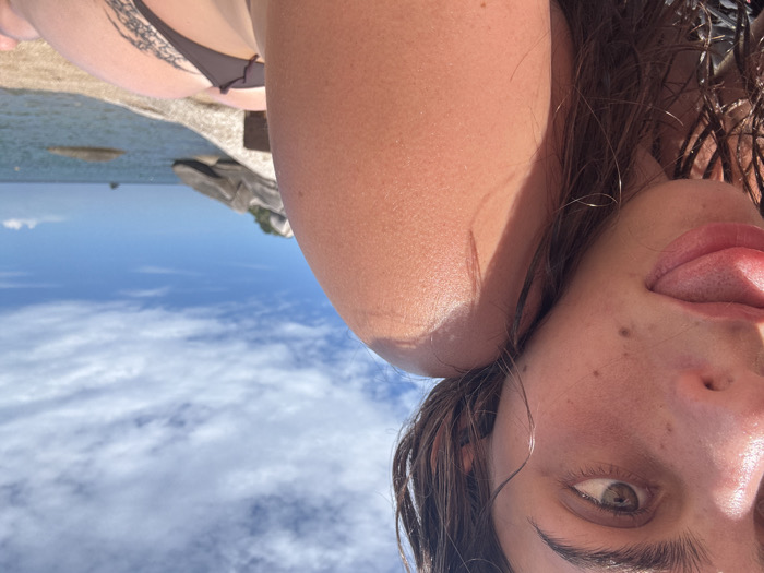 The image captures a close-up, low-angle perspective of an individual on a beach in ตำบล เกาะเต่า, Thailand, under a clear blue sky with scattered white clouds. The upper left quadrant features the individual's face, displaying a tanned complexion, dark hair, and her tongue extended from her mouth. Her right eye is directed towards the upper right. The mid-right portion of the frame shows her tanned, possibly wet, left shoulder and upper arm. The lower right section reveals her lower back and left buttock, covered by a dark bikini bottom, with a black tribal-style tattoo visible on the left buttock. The background features a sandy beach leading to calm, blue-green ocean water, dotted with several large, smooth, grey rock formations along the shoreline and partially submerged.