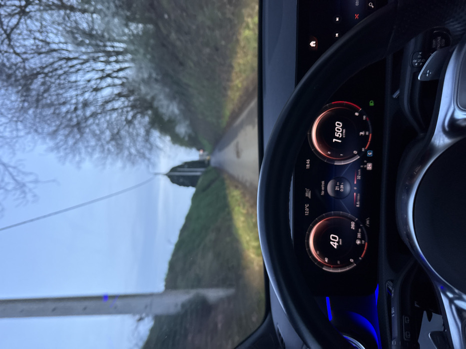 The image depicts a driver's perspective from within a vehicle, traveling on a narrow road in Tielrode, Belgium. The digital instrument cluster of the car, likely a Mercedes-Benz model, is prominent in the foreground. It displays a current speed of 40 km/h, an engine speed of 1500 r/min, an outside temperature of 12.0°C, and the time as 18:46. Trip information indicates "21 km" and "0:39" (minutes). The road ahead is a single lane, appearing to be unpaved or made of worn asphalt, and is illuminated by the vehicle's headlights. To the left of the road, a grassy embankment rises, with a utility pole positioned close to the roadside. To the right, deciduous trees with bare branches line the road, interspersed with lighter-colored foliage, possibly early spring blossoms. The road extends into the distance, converging towards a cluster of dense trees. The sky is overcast, indicative of twilight conditions. No other vehicles or individuals are visible in the scene.
