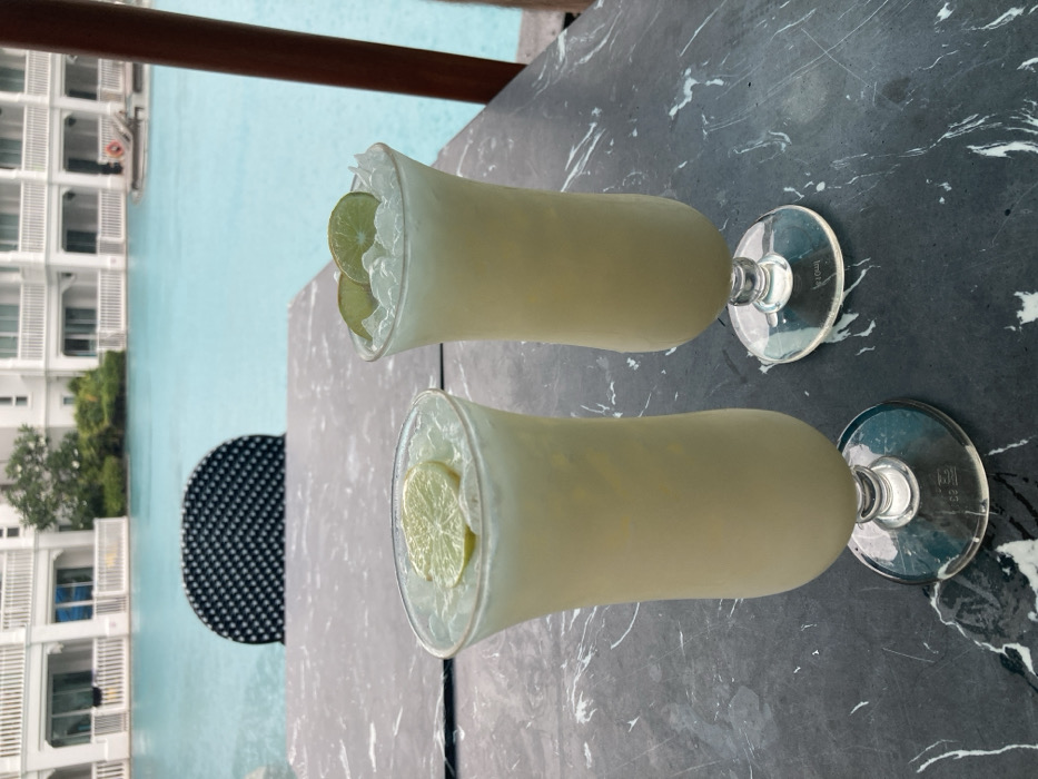 - "Two tall, stemmed glasses, each containing an opaque, pale yellow beverage with crushed ice and garnished with lime slices, are positioned on a dark, veined tabletop" by FM-DTOSi1, licensed under CC BY 4.0