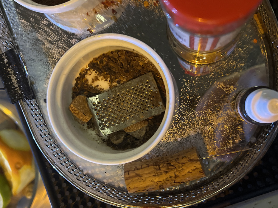 A close-up shot showcases a small white bowl filled with brown shavings and chunks of what appears to be nutmeg, accompanied by a grater. The bowl sits on a metallic tray, surrounded by additional culinary items including a jar, bottle, and what looks to be a cork. Powdery residue is scattered across the tray surface, suggesting recent grating activity. The overall composition hints at gourmet food preparation or flavoring.