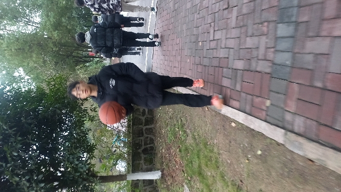 The image depicts an outdoor scene in Jiangjin, China. A young male, possibly a student, with short dark hair and wearing glasses, is centrally positioned in the foreground. He is dressed in a black puffer jacket with a light emblem on the left chest, black trousers, and orange athletic shoes. He holds a regulation-sized orange basketball in his left hand, while his right hand is in his jacket pocket. He is walking forward on a brick-paved pathway, looking directly towards the camera. Behind him, further down the pathway, a group of four additional young males, similarly dressed in dark winter jackets, walk away from the camera. The pathway is constructed from rectangular bricks in shades of red and dark grey, arranged in a herringbone pattern. A concrete curb separates the pathway from a grassy area on the left. To the left of the path, a large tree with dark green foliage has its lower trunk painted white. Beyond the grassy area and the tree, a low stone wall is visible, with more dense greenery behind it, suggesting a natural boundary or a body of water. The background features numerous trees with varying shades of green foliage, indicating a park, campus, or public promenade setting. The lighting is diffused, suggesting an overcast day or late afternoon.