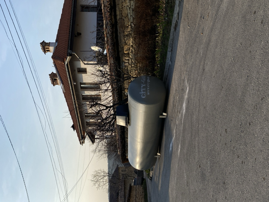 The image depicts a static outdoor scene in the city of Arbanassi, Bulgaria, under clear, sunlit conditions, likely late afternoon or early morning, given the long shadows. A large, horizontal, cylindrical grey gas tank, emblazoned with "cITY-GAS" and "WWW.CITY-GAS.EU" in white lettering, occupies the mid-ground on an asphalt-paved surface. The tank rests on four visible metallic support feet, with a black control housing positioned on its top surface near the left end. Behind the gas tank, a traditional two-story building with white stucco walls and a red-tiled roof is prominent. The building features multiple rectangular windows with dark frames and two distinct brick chimneys with decorative caps on its roofline. A white satellite dish is affixed to the side of the building, partially obscured by the bare branches of a dormant tree situated in front of a low, weathered stone wall topped with tiles. This wall separates the building's property from the paved area. Sparse, dark, leafless shrubs are visible behind the stone wall to the right of the gas tank. The asphalt pavement in the foreground shows cracks and light-colored streaks. Overhead, multiple dark power lines crisscross the light blue sky. In the distant left background, additional traditional buildings with tiled roofs and bare trees are visible, indicating a wider residential or rural landscape. No people or animals are present in the scene.