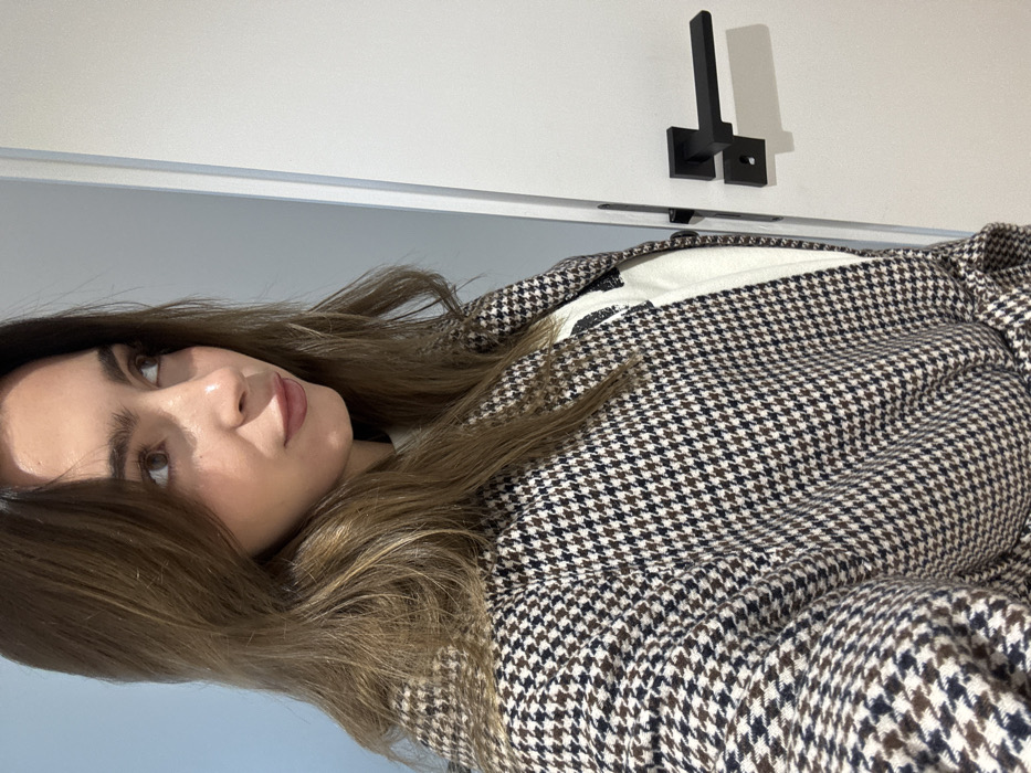 An individual is depicted in a close-up, indoor portrait taken in Loures, Portugal. The subject is a female, seen from the chest up, with medium-long brown hair styled loosely around her shoulders. She is looking upwards and to her right, away from the camera's direct line of sight. Her attire includes an outer garment featuring a distinct houndstooth pattern in brown, off-white, and dark blue, worn over a light-colored, likely off-white, inner layer. The background consists of a plain light blue-grey wall on the left portion of the frame and a white door with a black, square-based door handle on the right. The lighting is uniform, indicating an interior setting. No specific actions or interactions with other subjects or objects are apparent beyond the act of posing for the photograph.
