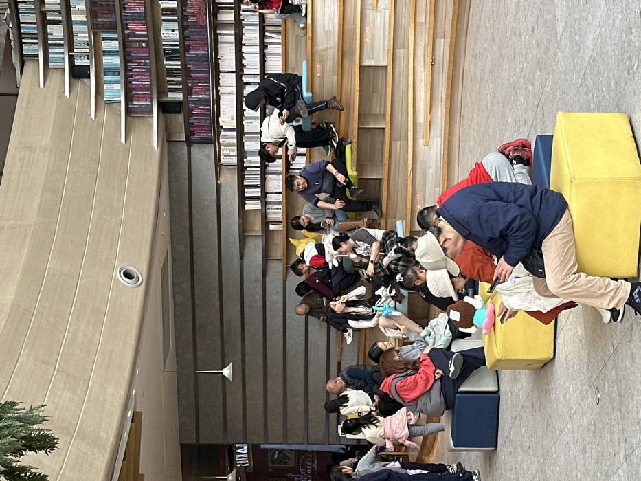 This image depicts a bustling indoor public space, identified as being in Liangjiang, China. The scene is dominated by a large, architectural tiered seating structure constructed from light-toned wood, reminiscent of an amphitheater or grand staircase. Numerous bookshelves filled with books are integrated into the vertical risers of these steps, creating a library aesthetic. The floor is covered with large, light grey tiles. Approximately 30-40 individuals of diverse ages, from young children to seniors, are present. Most are seated on the wooden tiers, some utilizing small, brightly colored cushions in lime green and light blue. Others occupy square, cushioned ottomans in yellow and dark blue on the ground level. The majority of seated individuals, particularly adults and teenagers, are observed looking at or interacting with mobile phones. Several small groups appear to be engaged in quiet conversation. A young girl, dressed in a pink jacket and grey pants, is visible on the far left. A woman in the mid-ground holds a light blue plush toy. The overhead structure includes a large, curved ceiling element in a light material, with recessed circular lights and white pendant light fixtures suspended below. In the upper left background, green foliage hangs from the ceiling. A partially visible sign displaying "COFFEE" indicates the presence of a café or similar establishment nearby. All individuals are dressed in casual attire.