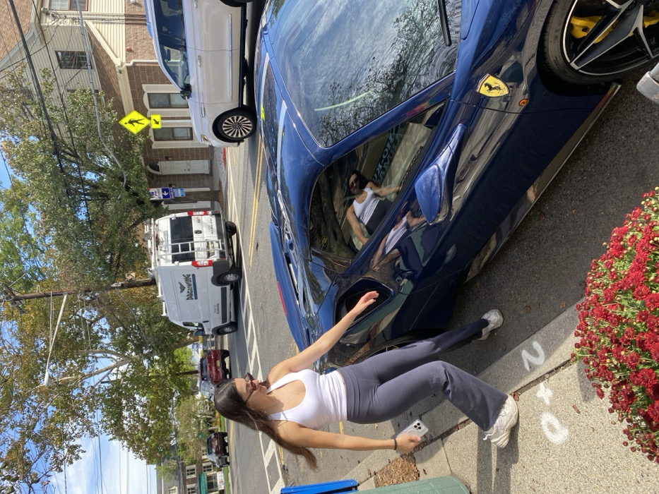The image depicts a daytime street scene in Ridgewood, New Jersey, United States. In the foreground, a female with long dark hair, wearing a white halter top, dark gray flare pants, white sneakers, and sunglasses, stands on a concrete sidewalk. She holds a light-colored smartphone in her left hand and extends her right arm towards the open driver's side window of a dark blue Ferrari sports car, which is parked parallel to the curb. Inside the Ferrari, a reflection shows an individual, likely male, in a white tank top and dark sunglasses, reclining in the driver's seat. The Ferrari features yellow brake calipers and a yellow Ferrari emblem. The immediate foreground includes a dark green utility pole and a cluster of red flowers in a planter. White chalk markings "P" and "2" are visible on the sidewalk. In the background, a white Ram ProMaster commercial van with "PACKWING" branding is present on the street. A white Lincoln Navigator SUV is parked or moving behind the Ferrari, and other vehicles, including a red SUV and a dark sedan, are visible further down the street. Residential-style buildings, utility poles with wires, blue street signs, and a yellow pedestrian crossing sign are present along the street, which features white crosswalk markings. The scene is brightly lit by natural sunlight, indicating clear weather conditions.