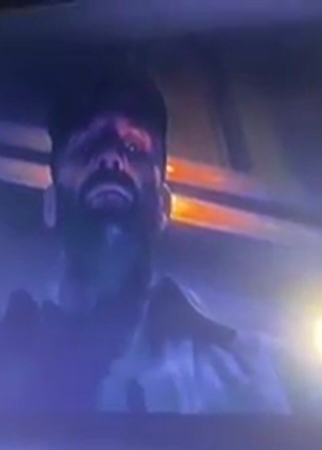 scene from a movie or TV show. A man with a beard and a black hat looks up and says, "You're done." The scene then cuts to a group of people in FBI tactical gear running through a building, holding guns. There is a large explosion, with flames and smoke filling the room.
