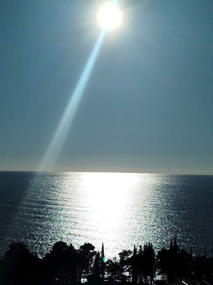 The image depicts an elevated view of the Adriatic Sea from Šušanj, Montenegro, under bright daylight. The sky occupies the upper two-thirds of the frame, presenting a clear, light blue hue. A brilliant, overexposed circular sun is positioned in the upper center, emitting a distinct, diagonal lens flare or sunbeam that extends downwards towards the horizon. The horizon line is sharply defined, separating the sky from the sea. The sea surface exhibits intense specular reflection from the sun, creating a wide, shimmering path of light that extends from the horizon towards the bottom right. The water beyond this path appears dark blue with subtle surface texture. The lower portion of the image, approximately one-fifth, shows a dark silhouette of a terrestrial landscape, primarily comprising various evergreen trees, possibly including cypresses or similar conical varieties. No individuals, specific actions, or identifiable man-made structures are discernible within this silhouetted foreground.
