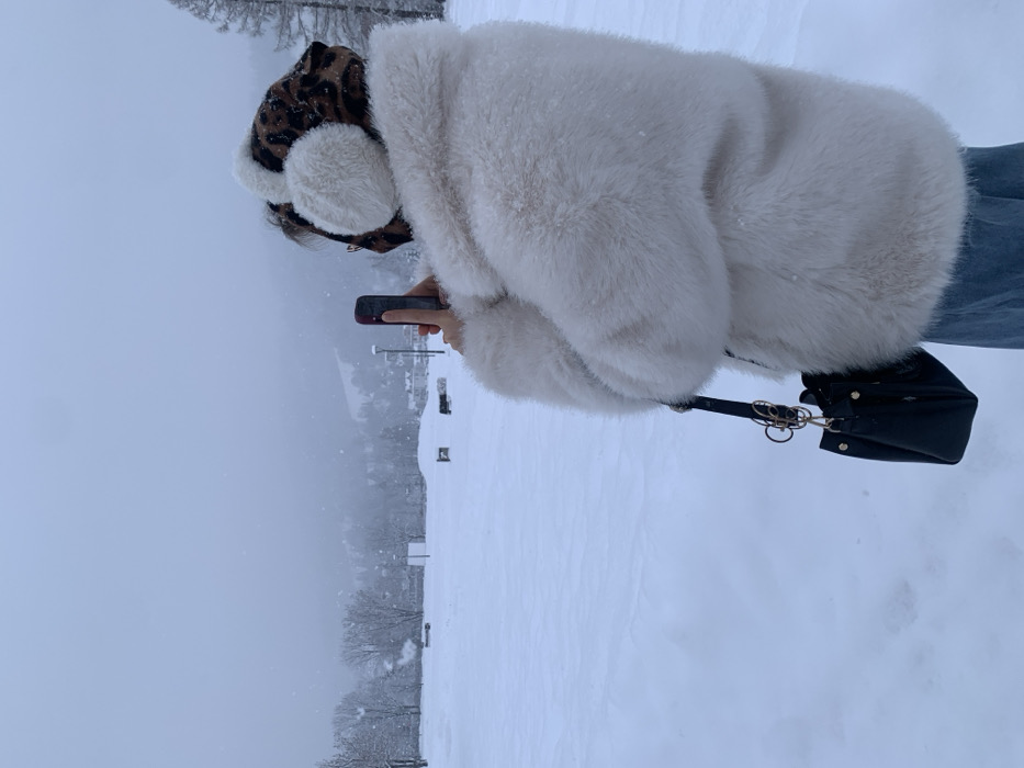 A person in a white, faux fur coat, blue pants, and leopard print earmuffs is standing in a snow-covered landscape. They are holding a cell phone in their hands, presumably taking a picture. A black purse hangs from their shoulder. The snowy ground and sky suggest a cold and overcast day. Bare trees and a distant building add depth to the winter scene.