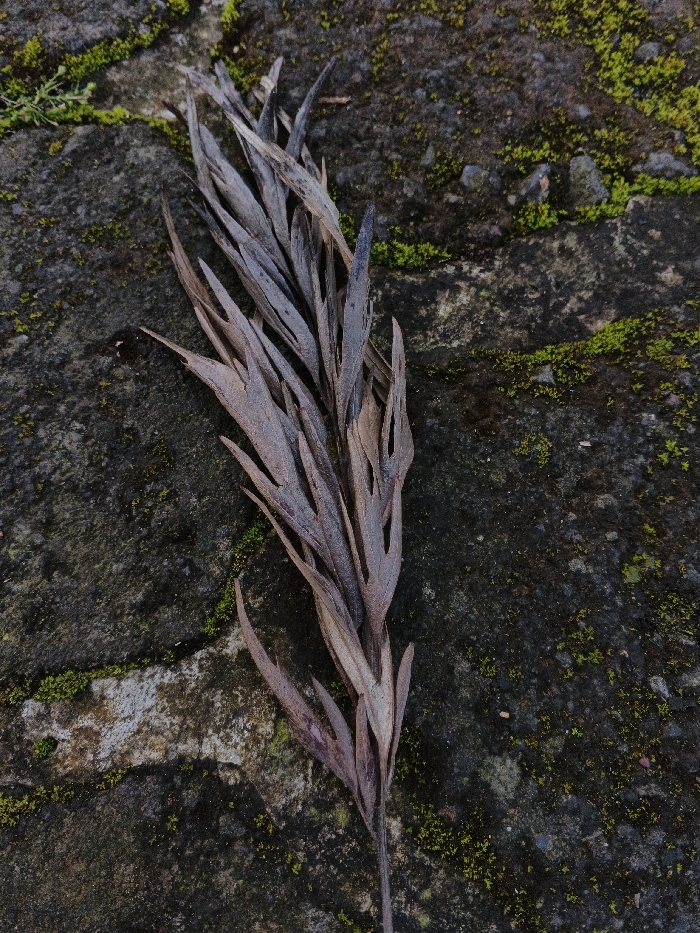 - "The image presents an overhead, close-up view of a single dried plant stem with multiple shriveled, pointed leaves, oriented diagonally from the lower-center towards the upper-left" by FM-B2GCN2, licensed under CC BY 4.0