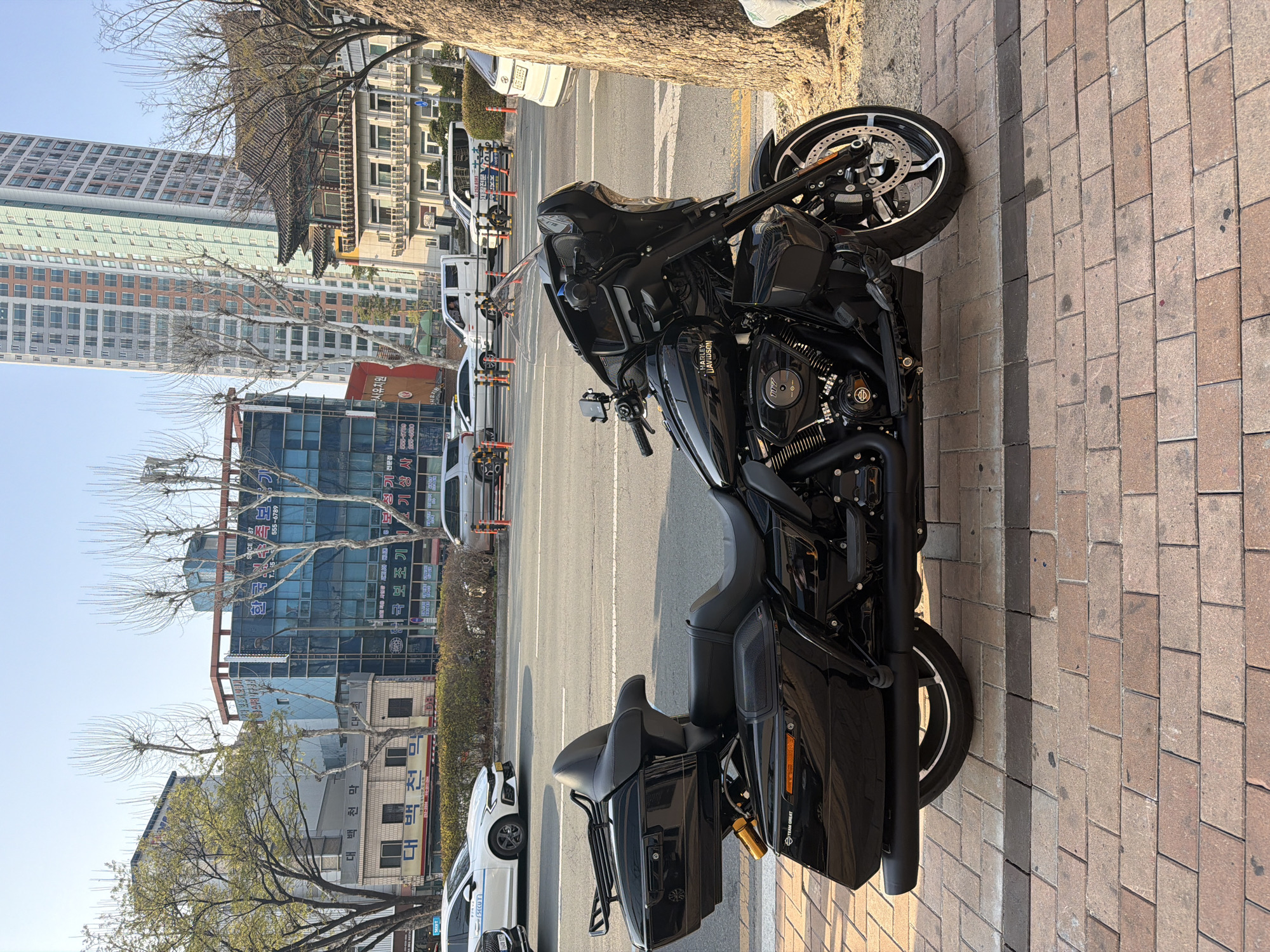 The scene depicts a black Harley-Davidson touring motorcycle parked on a brick paver sidewalk at Gukchaebosang-ro, Jung-gu, Daegu, South Korea