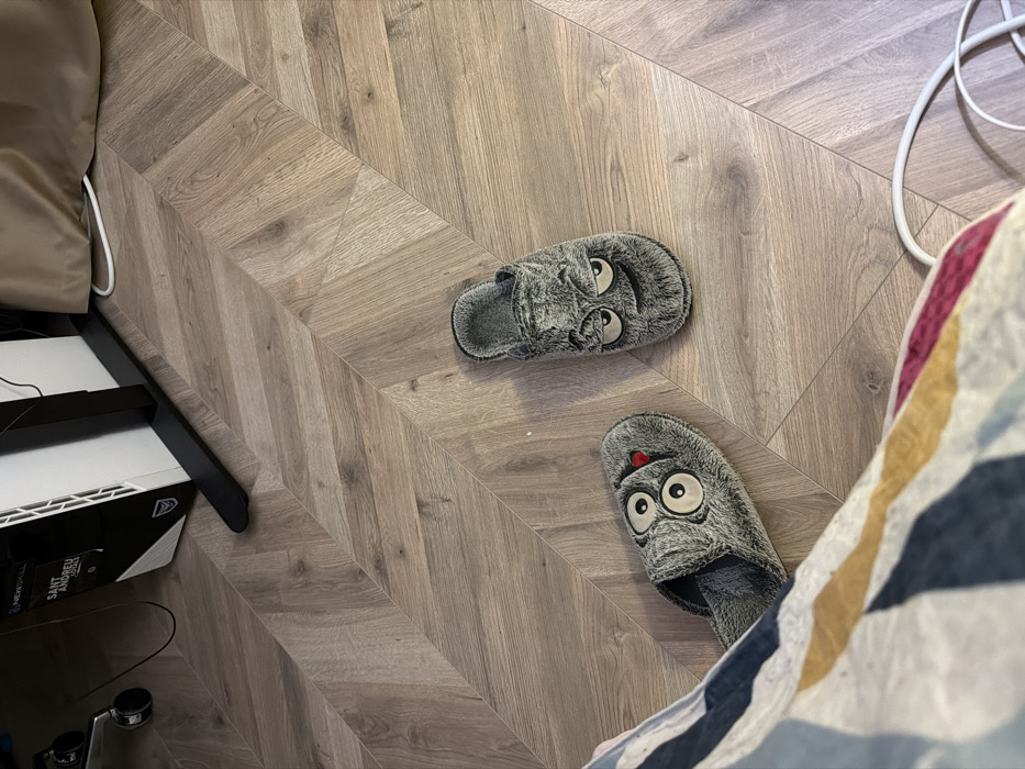 The image depicts an indoor scene, likely a residential room, from an elevated perspective looking down at the floor. The specific location in the city of Kavarna, Bulgaria, cannot be determined from the visual information provided. The floor is covered with light brown, wood-patterned flooring arranged in a chevron or herringbone pattern. In the center-right of the frame, two grey, furry slippers with embroidered facial expressions are visible. The slipper on the left, partially obscured by a person's lower left leg and foot, displays large, round, open eyes and a small red nose. The slipper on the right exhibits squinted eyes with defined brows and a subtle downturned mouth. A portion of a person's lower left leg and foot are visible in the lower-left corner, covered by fabric featuring horizontal stripes in white, blue, yellow, and red/maroon. In the upper-left background, a white and black computer tower, branded "NEWSKILL" and "SANT ANDREU LLOPIS," rests on a black stand. Adjacent to the computer tower, a single caster wheel from what appears to be an office chair is partially visible. Black and white electrical cables are present on the floor in the background and foreground, near the computer tower and extending towards the lower-right. A light brown or beige fabric element, possibly a curtain or part of furniture, is visible in the upper-right background.