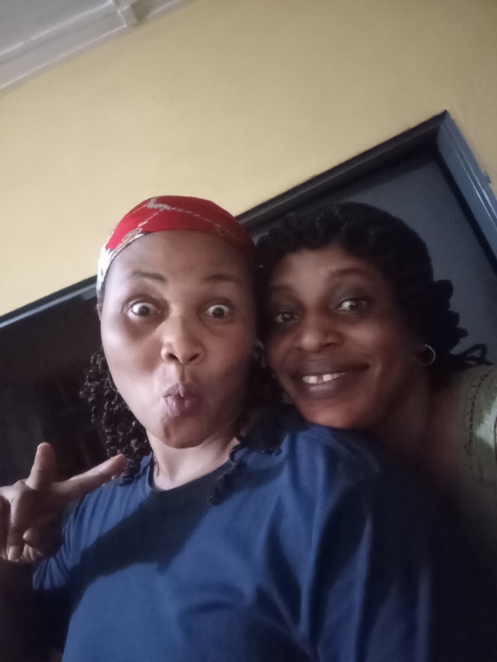 Two women are posing closely together indoors. The woman on the left wears a red and white headscarf, a dark blue shirt, and is making a surprised face with puckered lips and pointing to the side with two fingers up. The woman on the right has black curly hair, is smiling with visible front teeth, and wears a small hoop earring and a light green top. A doorframe is visible behind them, and a yellow wall is in the background.