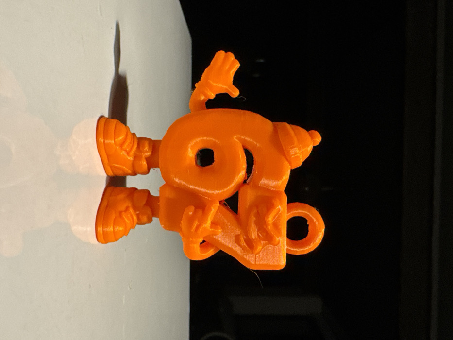 An orange, 3D-printed figure, resembling the number '69' with added features, is oriented horizontally