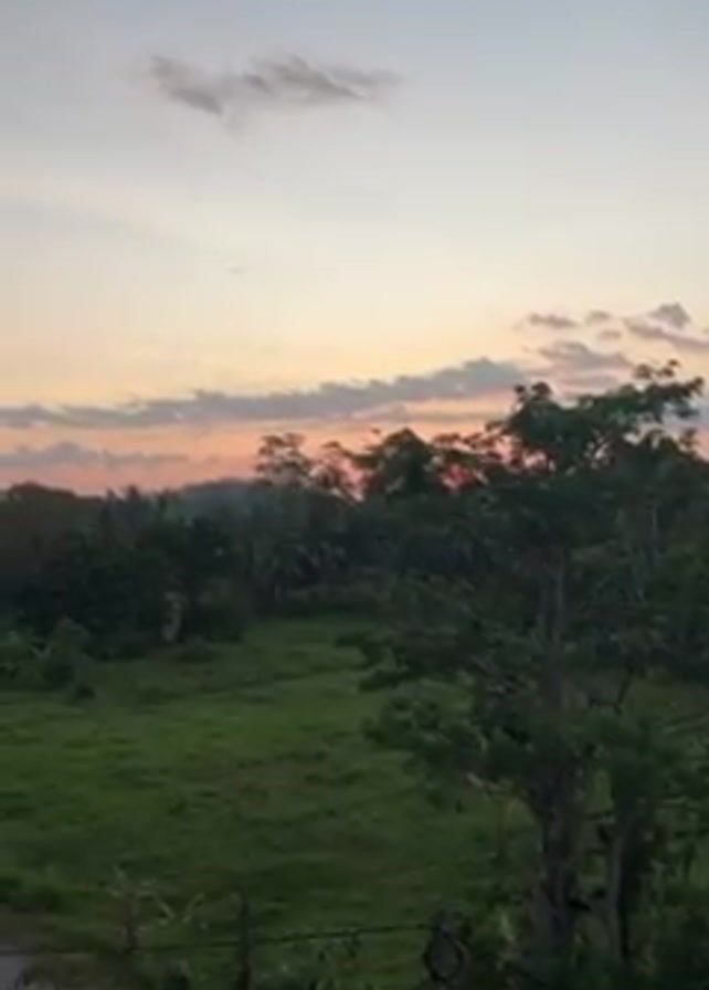 sunrise or sunset over a rural landscape. In the foreground, there's dense green vegetation, including trees and fields. A narrow paved road cuts through the landscape, and a few individuals can be seen walking or cycling along it. The sky displays hues of orange, pink, and blue, indicating dawn or dusk. There's a palm tree partially visible on the left side of the frame, and some utility poles line the road. The overall scene appears peaceful and serene.