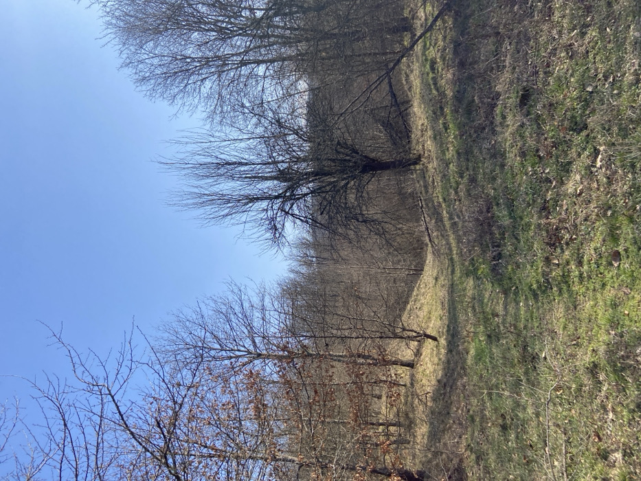 The scene depicts a wooded, rural landscape situated within or adjacent to the city of Mindia, Bulgaria. The terrain is undulating, featuring a shallow depression or natural path that traverses from the foreground towards the background. Ground cover consists of sparse green and dry brown grass, interspersed with leaf litter and patches of bare earth. Visible objects include multiple deciduous trees, predominantly bare of foliage, indicating a dormant season. A cluster of trees on the left side of the frame retains some dry, light brown leaves. Several fallen branches or logs are present on the ground within the central depression. Denser forest lines the rising ground on both sides and extends into the background. The sky overhead is clear and bright blue, devoid of clouds. The illumination is consistent with natural daylight. No individuals, animals, man-made structures, actions, or interactions are discernible within the image.