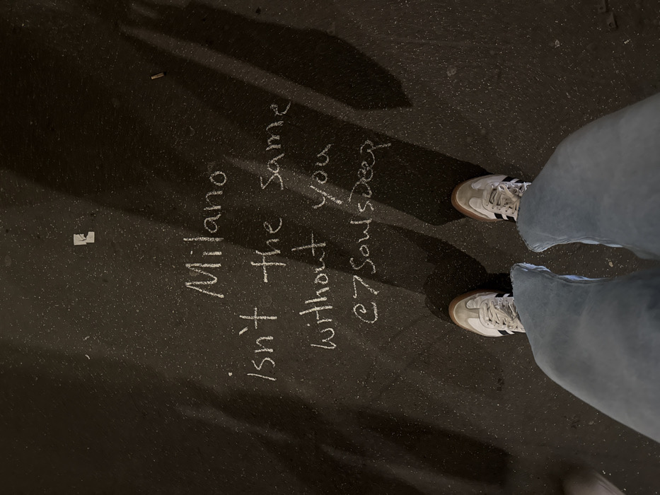A pair of legs clad in light blue jeans and white sneakers stand on dark pavement. The pavement is covered with white chalk writing that reads, "Milano isn't the same without you @7soulsdeep." Shadows fall across the pavement, creating a somber mood. A small piece of white debris lies on the ground near the chalk writing.