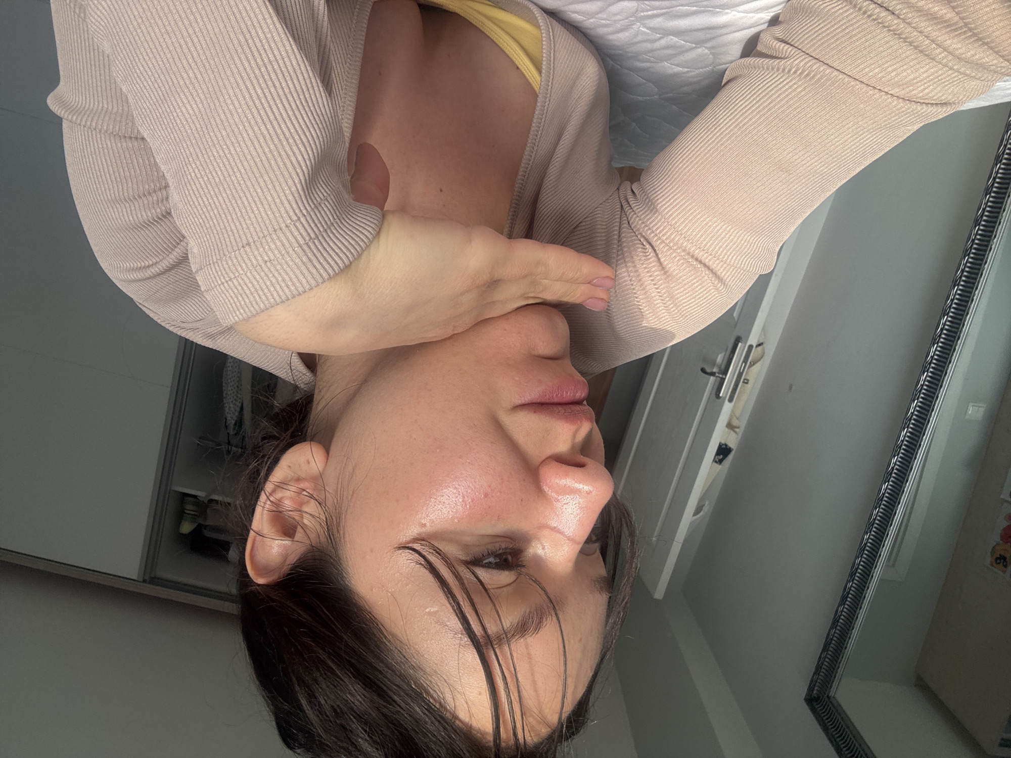 A woman with dark hair is pictured indoors, facing towards the right of the frame. She has her right hand covering the right side of her face. She is wearing a beige cardigan with a yellow top underneath. Behind her, there's a mirror and what appears to be a closet. The image is taken at an unusual angle, rotated approximately 180 degrees. The location is Burgas, Bulgaria, with the coordinates (42.506168, 27.466742).