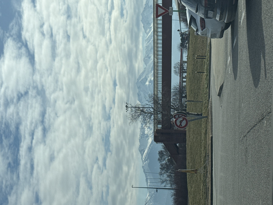 The image depicts an outdoor scene in Saint-Jeoire-Prieuré, France, under a partly cloudy sky. In the foreground, asphalt pavement with visible cracks and a white marking line occupies the bottom left. On the right, the rear sections of two parked or stationary vehicles are visible: a white car with a French license plate (e.g., "GE-272-W") followed by a dark-colored vehicle. Shadows of these vehicles are cast on the asphalt, extending towards the left. The mid-ground features a grassy embankment that rises slightly. Two circular French road signs are mounted on a single pole: the upper sign is a "no left turn" indication, and the lower sign is a "no right turn" indication. To the left of these signs, a tall light pole with multiple floodlight fixtures stands near a leafless deciduous tree with slender branches. Stretching horizontally across the mid-ground is a reddish-brown pedestrian overpass or bridge with partially transparent side panels. The bridge structure on the left appears to be made of brick or stone, with stairs leading up to it. On the right side of the bridge, a triangular "Yield" sign (Cédez le passage) is visible. Further back, beneath the bridge, a structure with multiple columns, possibly part of a commercial establishment like a gas station, can be vaguely discerned. The background is dominated by a range of snow-capped mountains under a sky dotted with scattered cumulus clouds. No individuals are present in the frame, and no discernible actions or interactions are occurring.