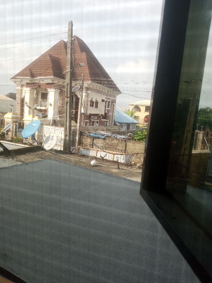 This image presents an outdoor residential scene in Satellite Town, Nigeria, observed from an elevated vantage point