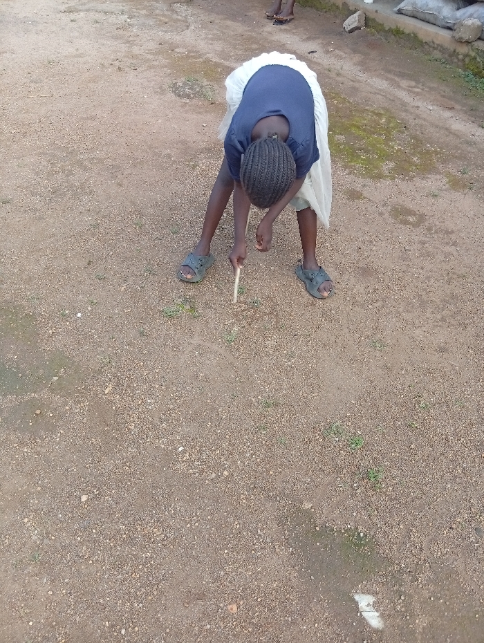The scene is set outdoors on a mostly flat, reddish-brown dirt and gravel surface in Unknown, Unknown. A person, appearing to be a young individual with dark skin and dark braided hair, is centrally positioned, bent forward at the waist. They wear a dark blue short-sleeved top, a light-colored skirt, and dark sandals. Their right hand holds a light-colored stick, which they are using to draw or scratch on the ground. The ground is uneven, comprised of small stones, dirt, and sparse patches of green vegetation; a small wet area is visible in the lower right. In the upper right background, the lower legs and feet of at least one other individual in sandals are partially visible, alongside indistinct objects, possibly sacks, resting against a low, light-colored structure.