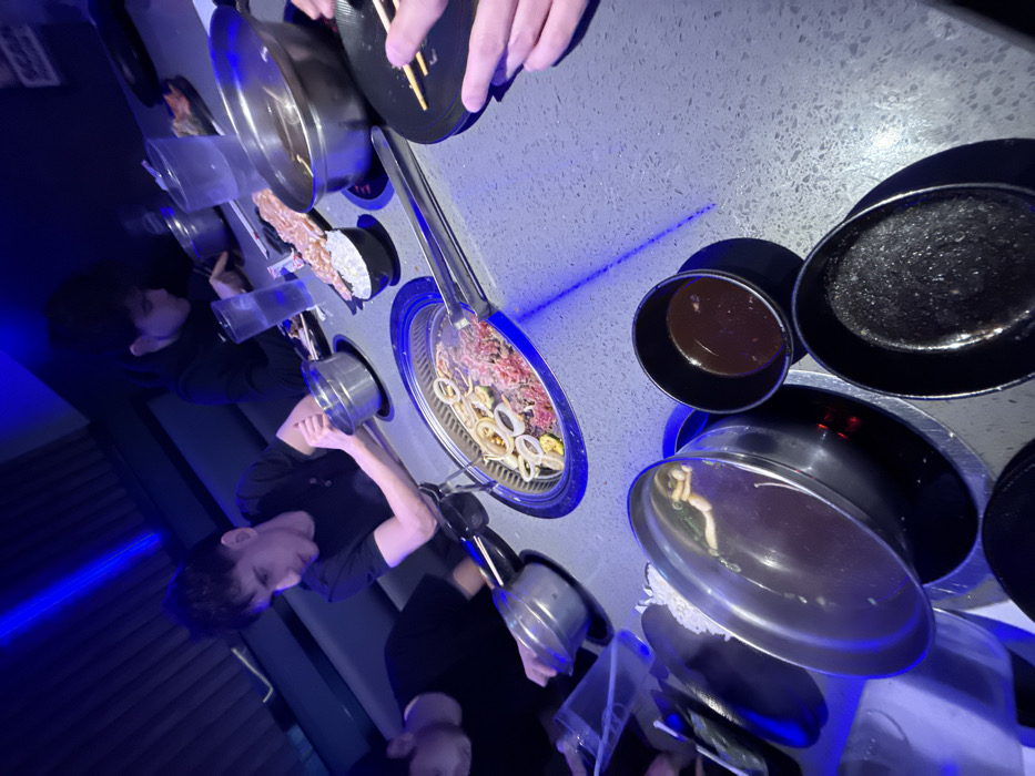 A group of people are seated around a table with a built-in grill, reminiscent of a hot pot or Korean barbecue setting