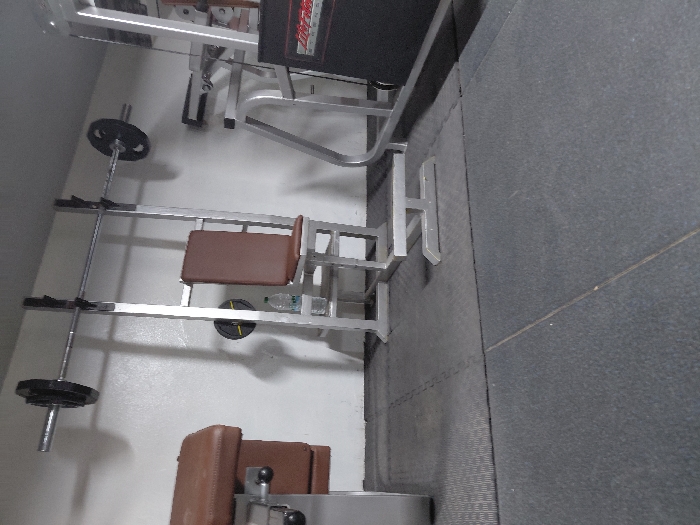 A weight-lifting area is visible. A weight machine with a padded backrest and metal frame occupies the upper part of the frame. A weight bar with several weights sits on a weight rack in the lower-left. A padded seat, likely for a different exercise, is near the bottom of the image. The machines and racks are set up against a white wall, and a gray rubber floor covers the right side of the image.