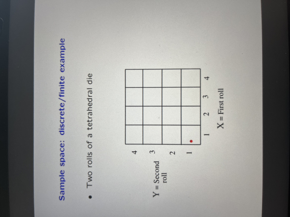 The image displays a digital screen, likely a laptop or tablet, showcasing an educational slide with a light gray background. The title, "Sample space: discrete/finite example," is rendered in blue text at the top. Below this, a black bullet point states, "Two rolls of a tetrahedral die." Centered on the screen is a 4x4 grid, outlined in black, representing a sample space. The vertical axis, labeled "Y = Second roll," has numerical indicators 1, 2, 3, and 4. The horizontal axis, labeled "X = First roll," also displays numerical indicators 1, 2, 3, and 4. A single small red dot marks the grid cell corresponding to the coordinates X=1, Y=1. The screen exhibits a slight glare originating from the upper left. No individuals or additional objects are visible within the frame. This scene is located in Rishon LeZion, Israel.
